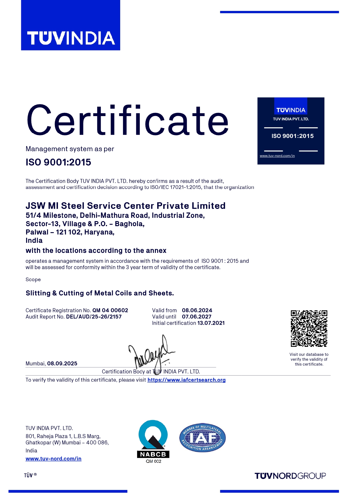 JSW MI Steel Service Center Pvt. Ltd. shall strive to sustain business excellence by adopting the best practices to improve the Quality of its products and services.